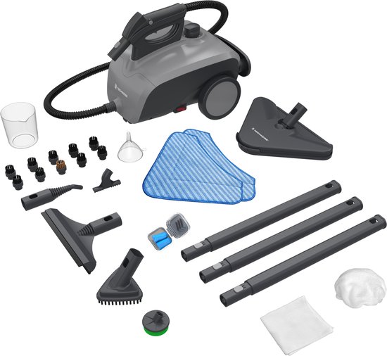 Net als de TS2 wordt de TS1 geleverd met 26 accessoires voor uiteenlopende reinigingstaken. Het verschil zit in de iets lagere stoomdruk en kortere stoomtijd — in de praktijk merk je dit alleen bij zeer hardnekkig vuil of heel grote woningen.